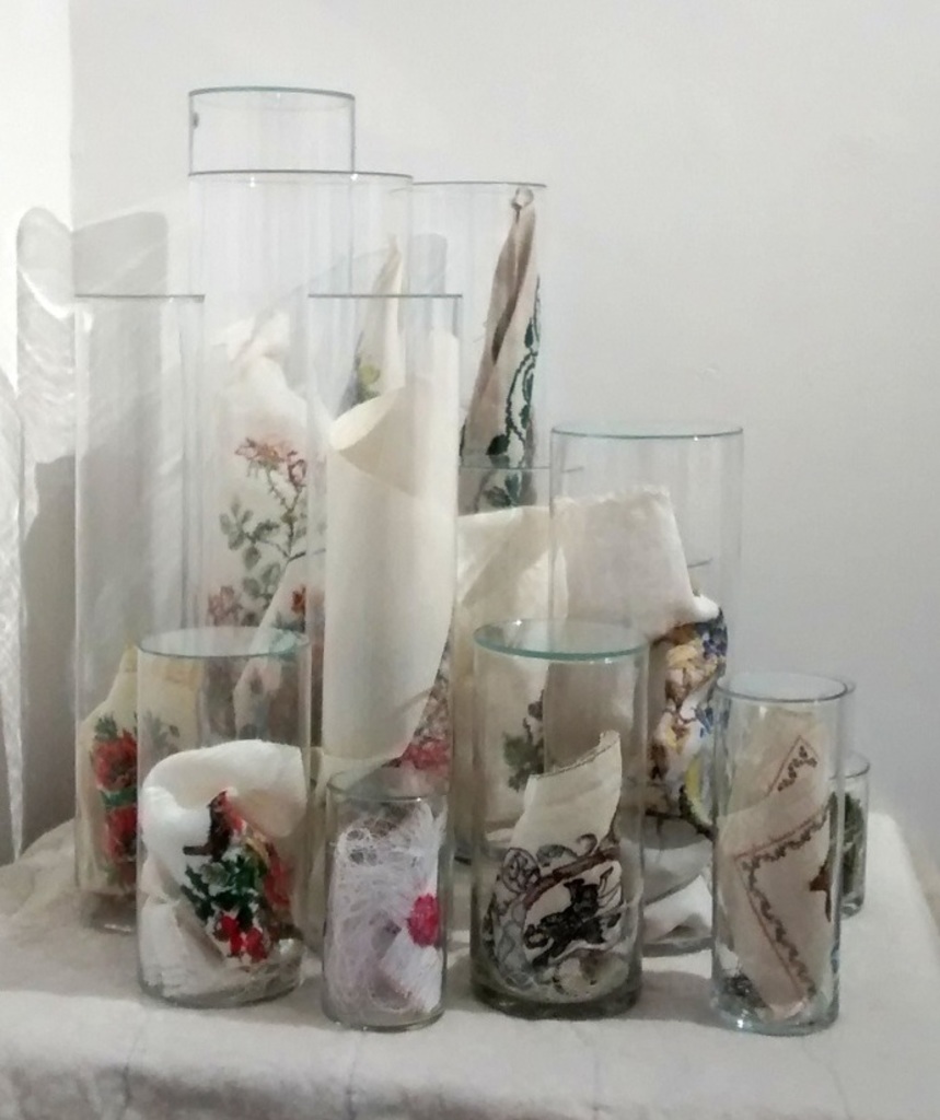 De indentiteit van de maker keert terug aan de achterkant van het borduurwerk. Door de achterkant zichtbaar te maken en in glas te verwerken hebben ze opnieuw een eeuwigheids waarde Variabele maten.