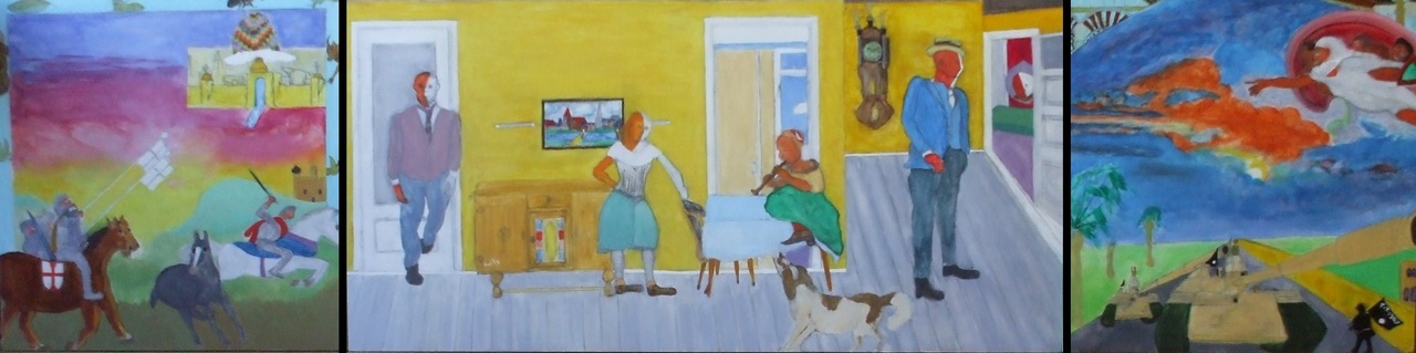 Geschiedenis ("ME")- heden verbeeld in oorlog en vrede, opgaande- en neergaande "zon". Cirkel van menselijke stijging en daling, steeds terugkerende dwaling?