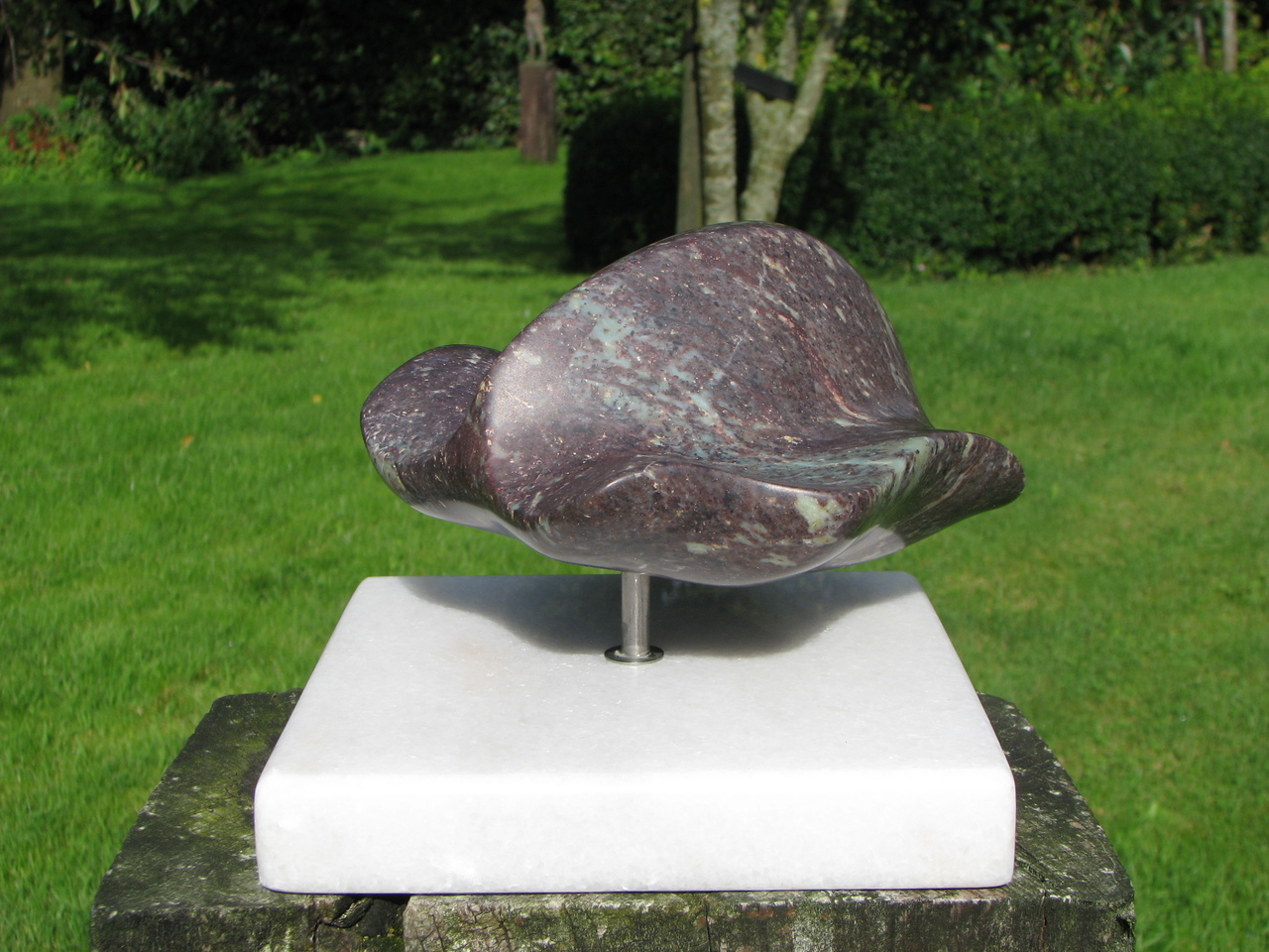 Een paarse serpentijn op een wit marmeren sokkel. Het beeld is schuin gepositioneerd op de sokkel waardoor het opstijgende karakter van dit beeld nog meer tot uiting komt.