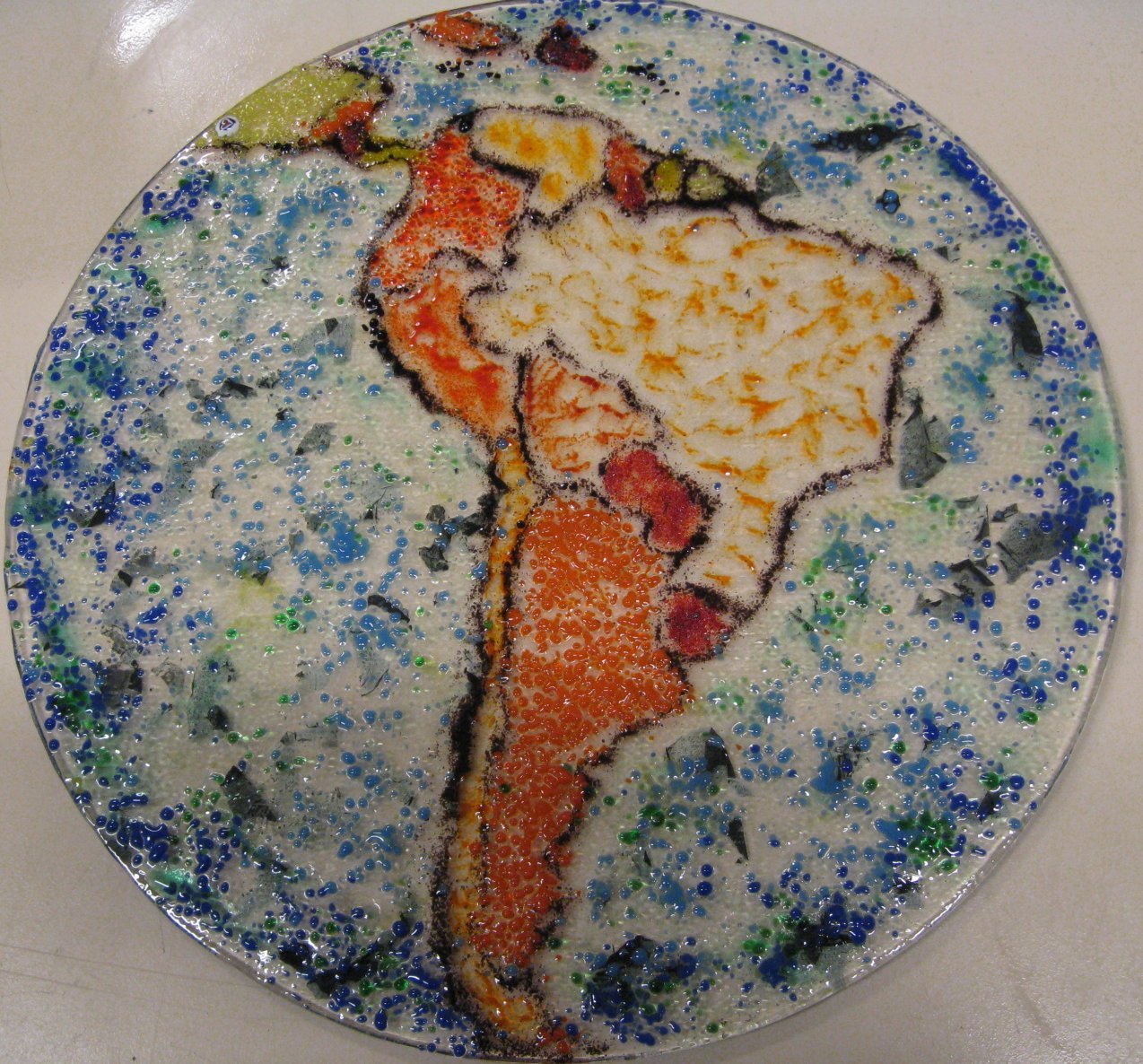 Zuid Amerika, uitgebeeld in glas. Ik heb er 2 gemaakt en natuurlijk verschillen ze iets van elkaar. ( 1 is een schaal geworden, de ander is een plateau waar kaarsen ed op kunnen staan.)