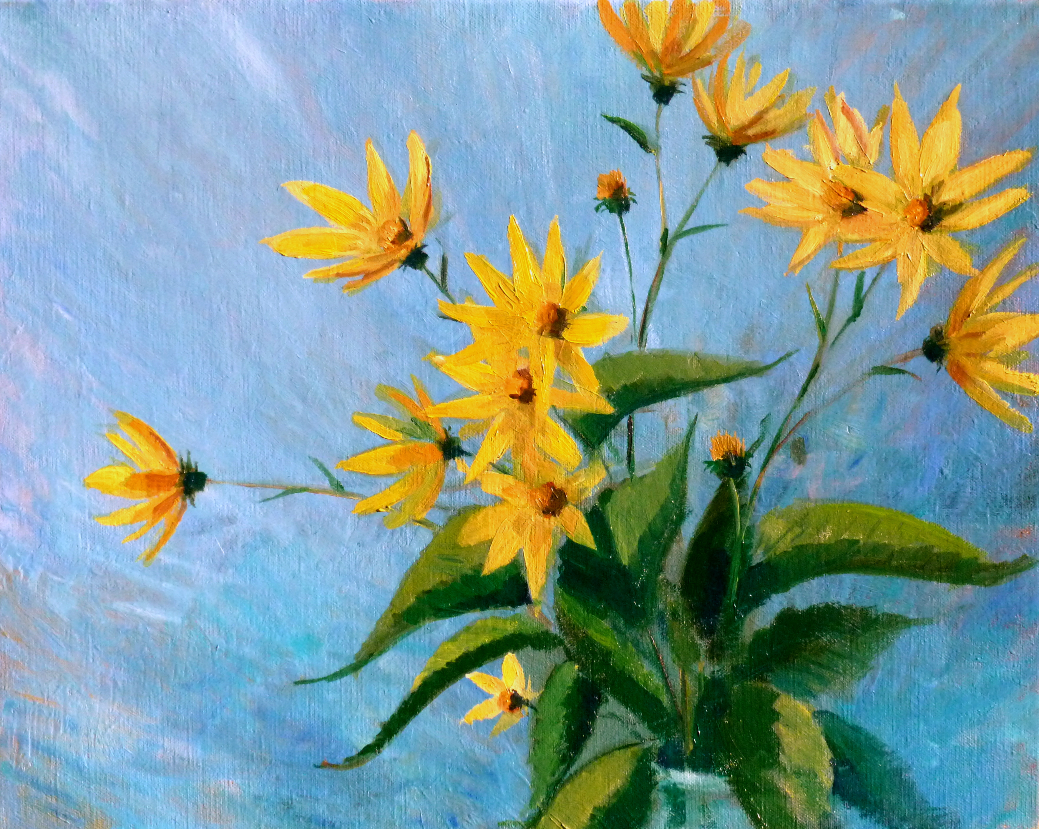 Topinambur, de oeverplant aan De Moezel met prachtig gele bloemen, olieverf op linnen.