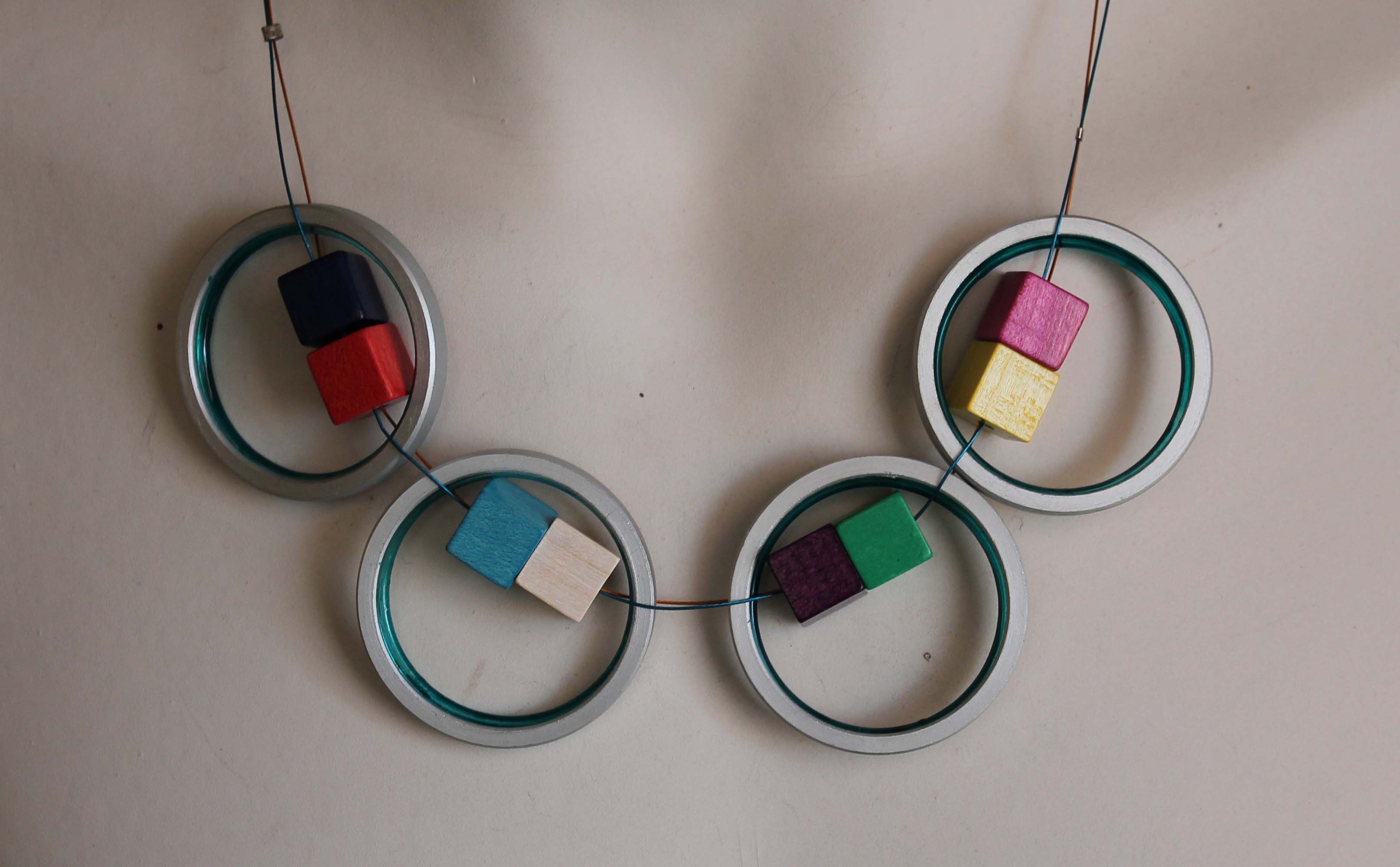 Aluminium ringen , met houten kralen er in gehangen. Prijs: € 35,-