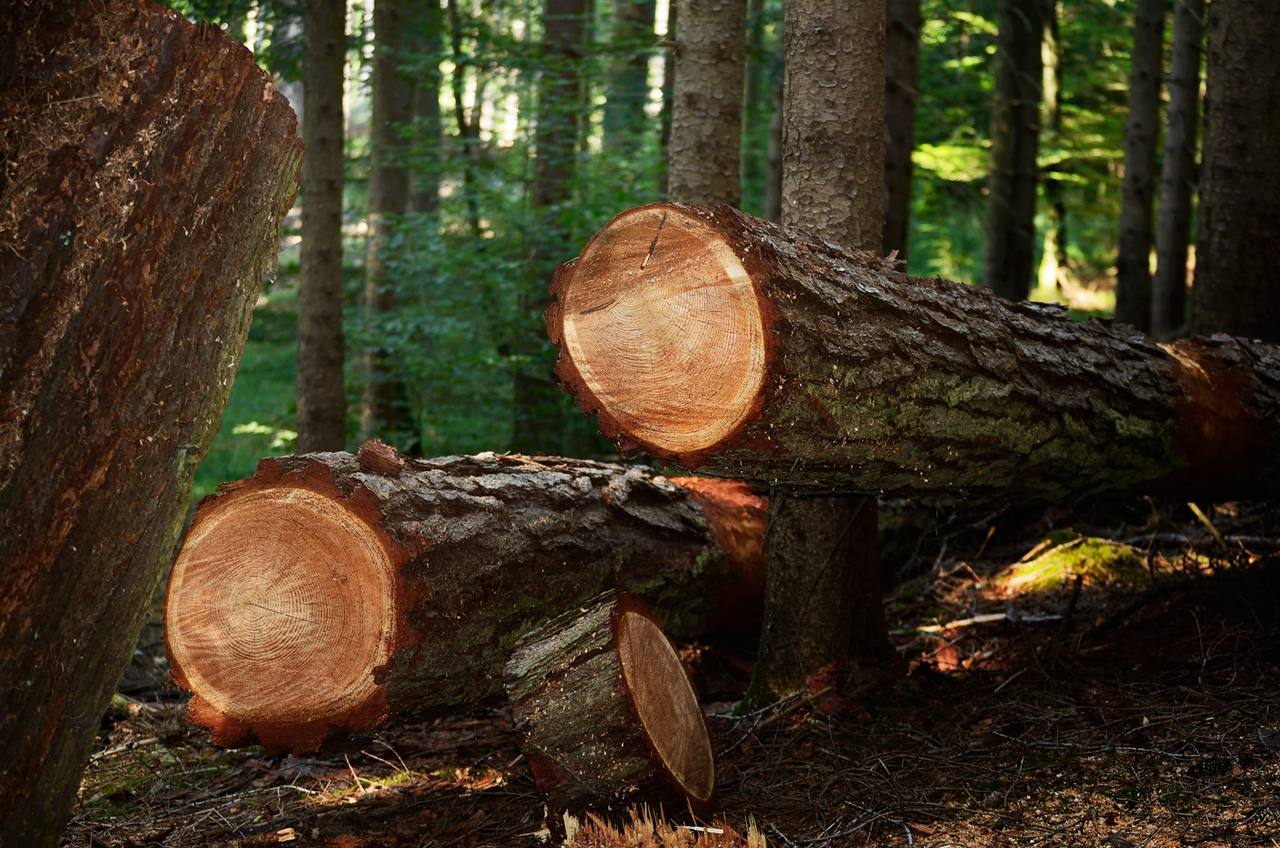 Omgezaagde bomen in het bos van Feldafing, Duitsland