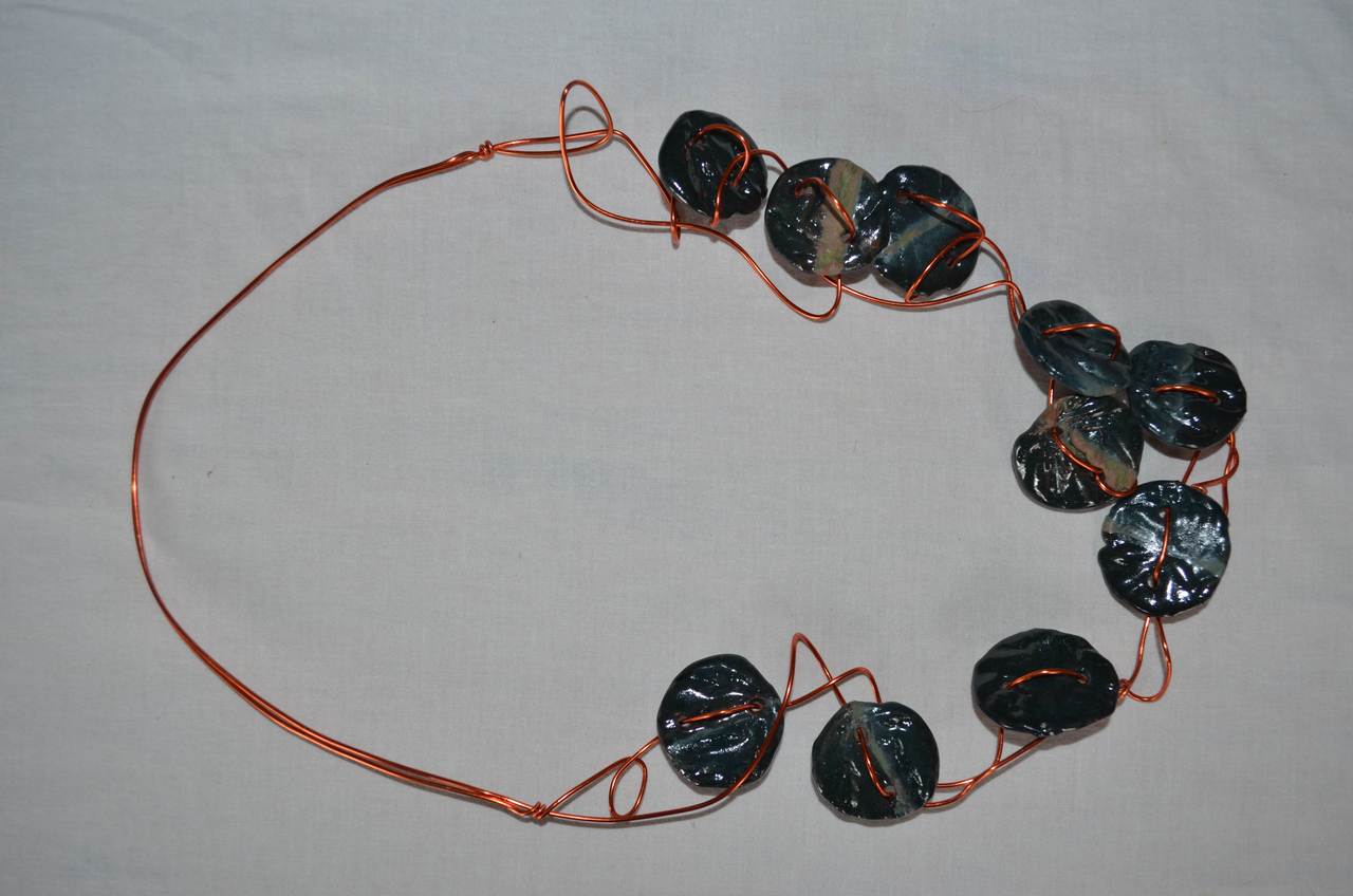 De ketting is van hoogwaardige goudkleurige aluminium. De spiraal vormige rondjes zijn handgedraaid en met petrol kleurige glazuur gespoten. De ketting kan is naar eigen inzicht in de gewenste vorm te drapperen.