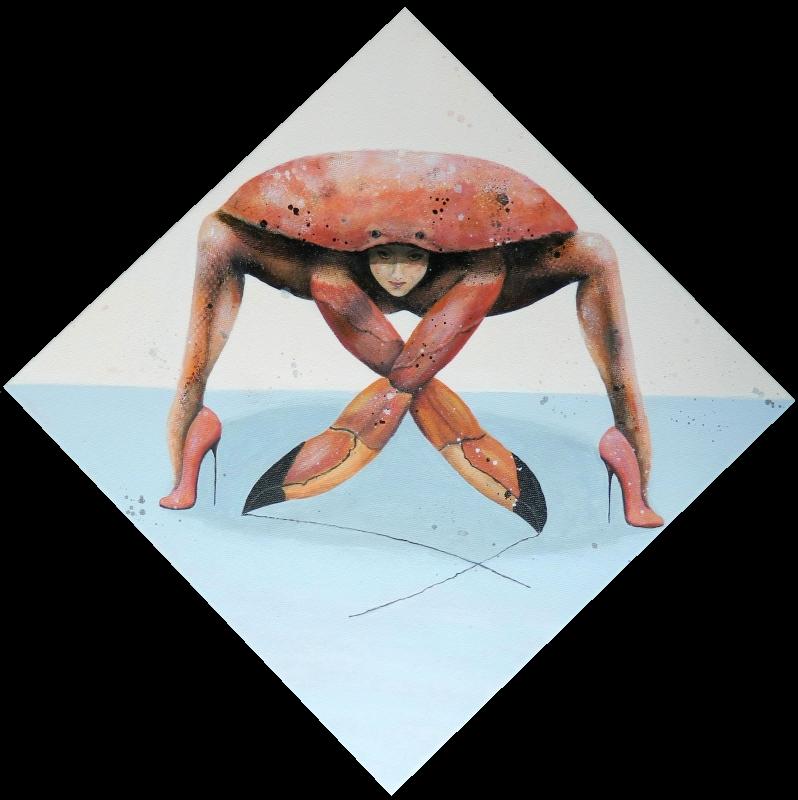 Sold Schilderij X (een uitstapje naar een ander diertje) is een klein schilderijtje van een vrouw met krabschaal en krabbenpoten. Altijd in haar eigen schaduw. Afmeting 40 x 40 cm. Op te hangen als ruit.