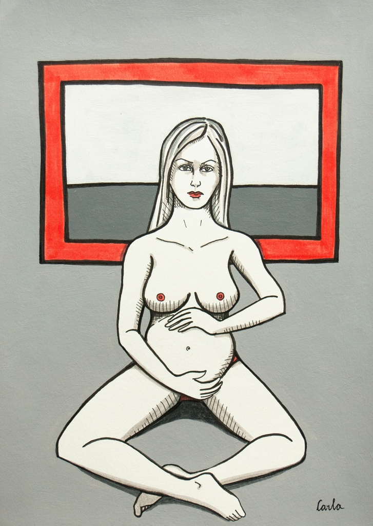 Vrouw Zwanger Vruchtbaar Grijs Rood Wit Zwart Surreeel Zelfportret
