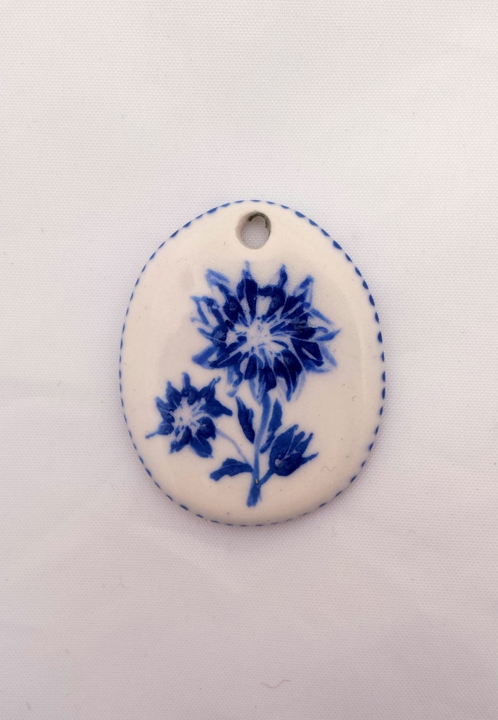 Ovale hanger met delfstblauwe beschildering van bloemen en blauw randmotief
