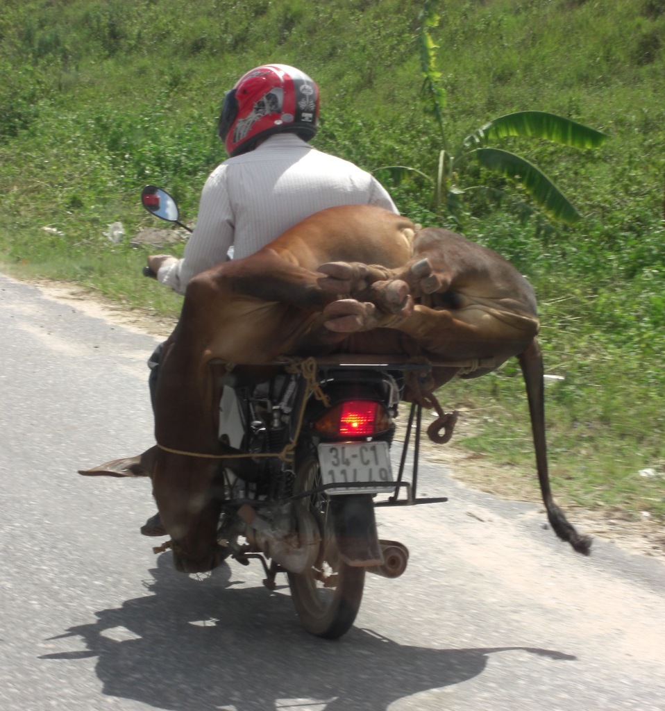 koe op een brommer