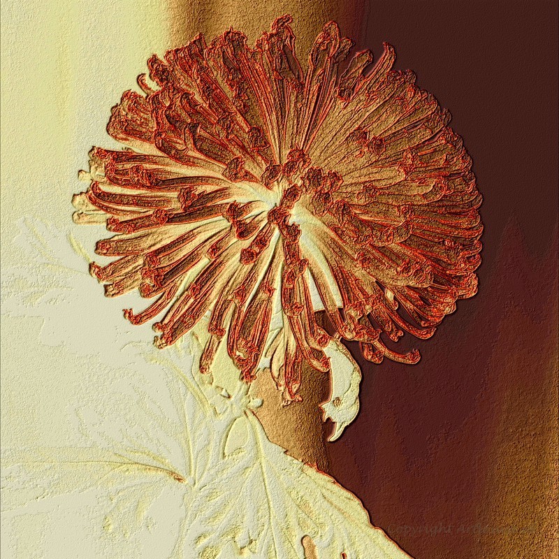 De Chrysant is dermate veelvuldig bewerkt dat het lijkt alsof het een ets is geworden. De afbeelding kan in elk gewenst formaat/materiaal geleverd worden.