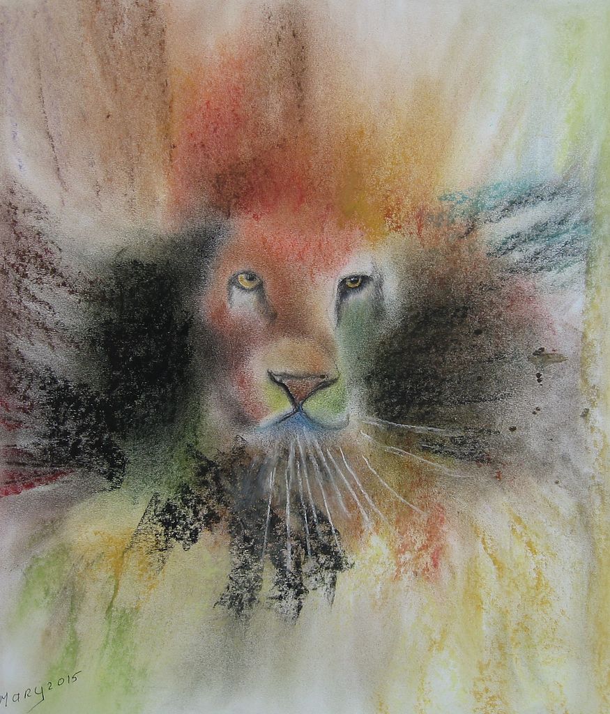leeuwenkop in pastel en kleurenpotlod