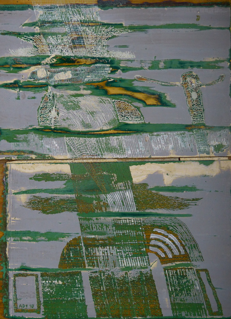Paneel waarop de onderlagen donker- en lichtgroen, zwart, plamuur en blank hout tevoorschijn komen. Bewerking met schuurschijf, stanleymes, els. Kleur wit toegevoegd.