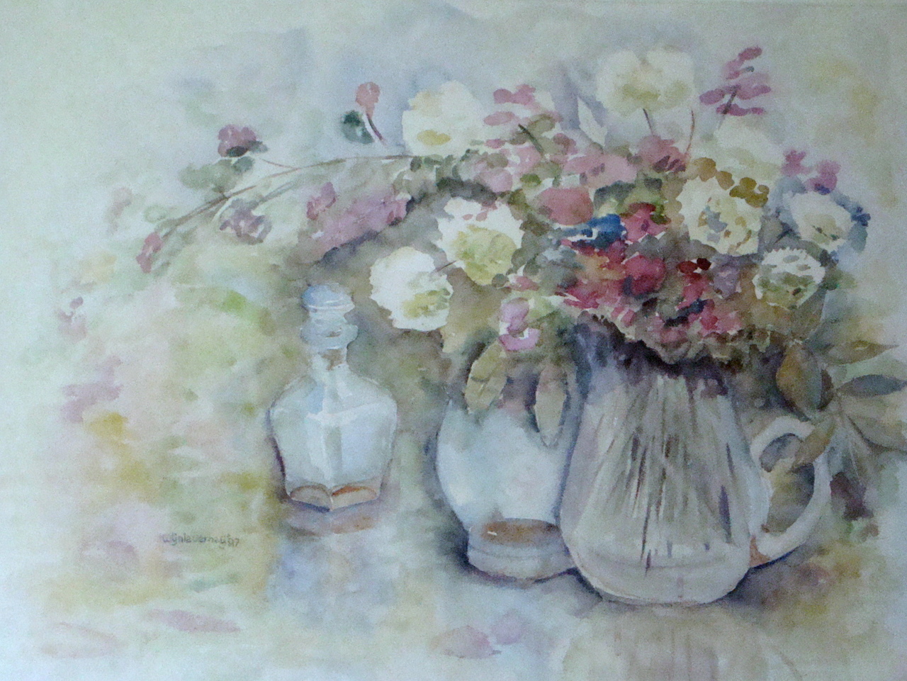 Bloemen met glaswerk, met passe-partout 100 x 70 cm