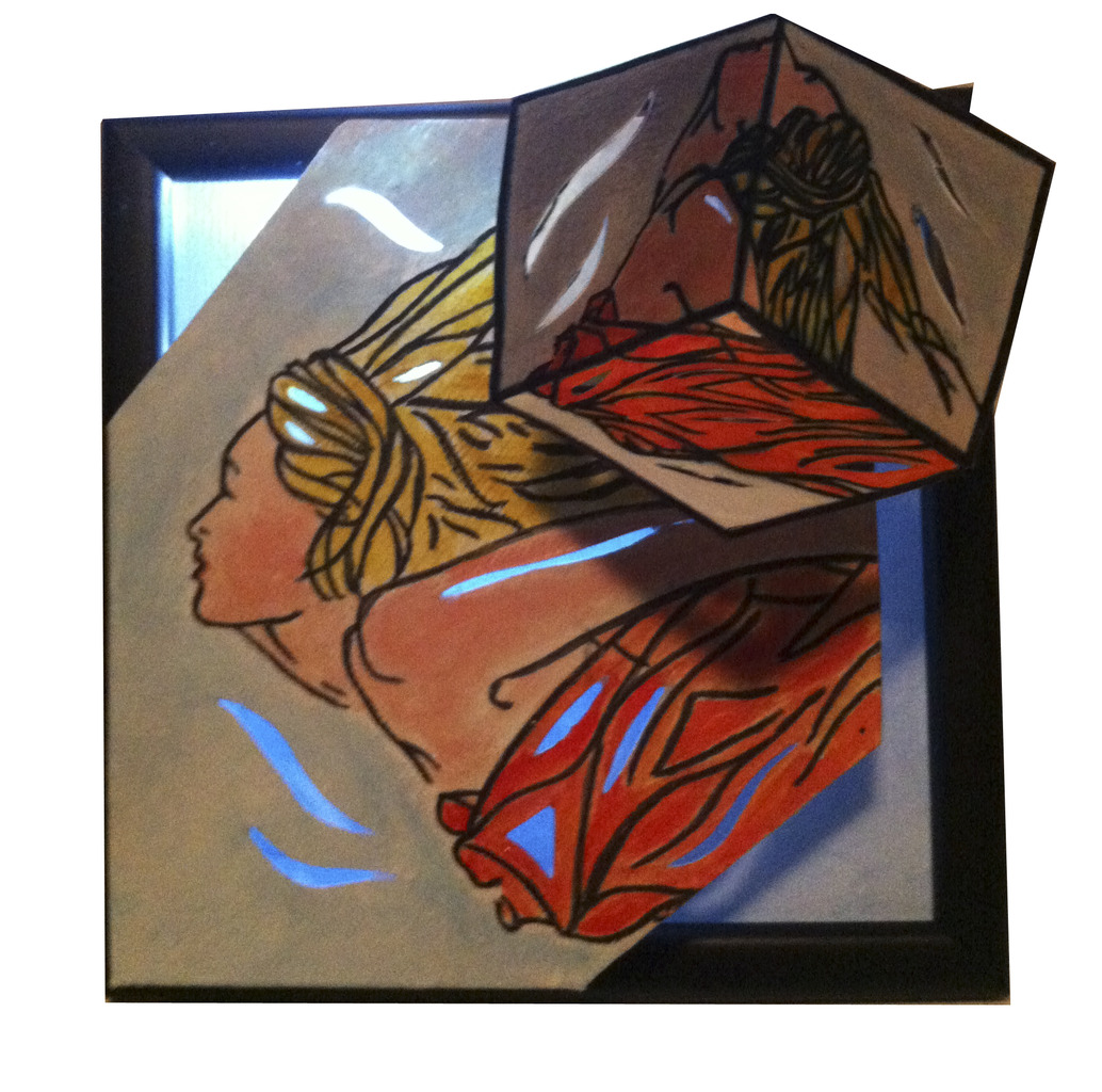 Zwevende kubus. Lees meer bij het werk klaproos waar eveneens een filmpje te zien is. Ook dit werk is met verlichting.