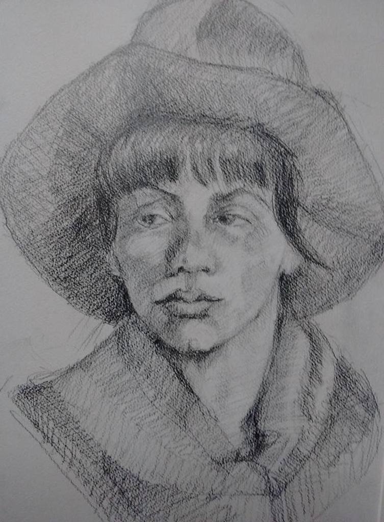 Marion met hoed gemaakt met grafietstift. inclusief passe partou.