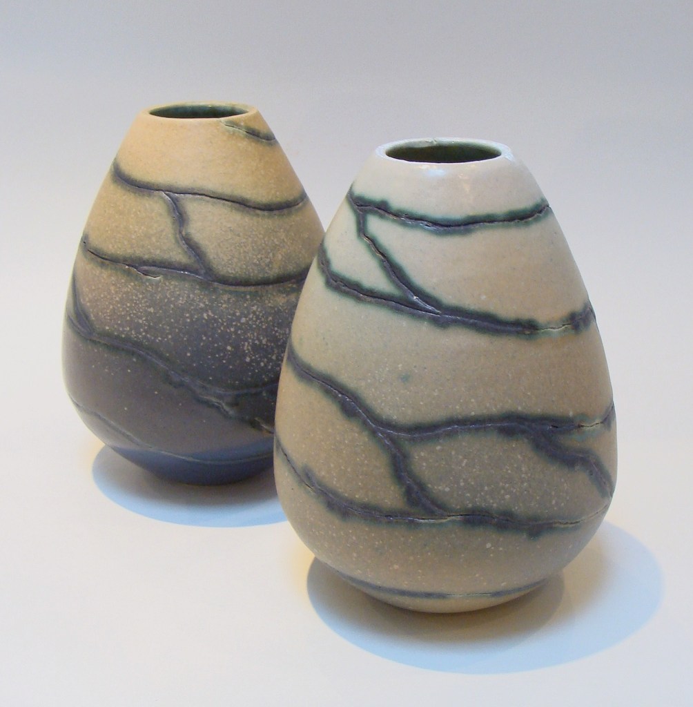 Twee kleine vaasjes, net iets in kleur verschillend, groeven ingewassen met koperoxide.