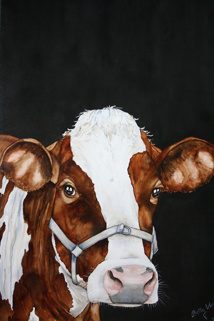 Daisy...portret van een roodbonte koe met halster tegen een donkere achtergrond. Aquarel door een speciale techniek op doek geschilderd.