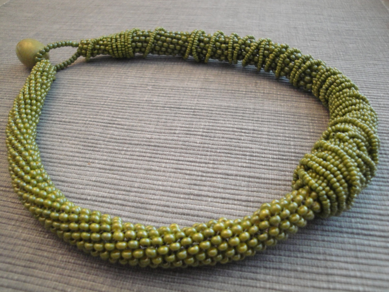 geregen rocaillekraaltjes (glas), kleur lichtmosgroen; asymetrisch; lengte ongeveer 50 cm, gewicht ongeveer 125 gr (niet te koop)