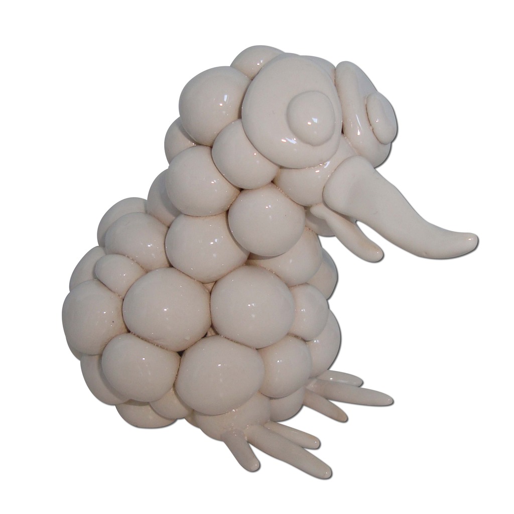 Werkwijze: Handmatig gerolde bolletjes en handmatig samengesteld. Materiaal: Witbakkende fijne chamotte klei. Deklaag: Wit glanzend.