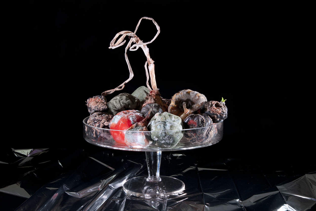 fruitstilleven, bedorven fruit in glazen schaal met grote ui