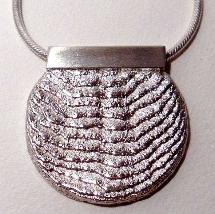 Gegoten zilveren hanger aan vierkante buis, met zilveren collier.