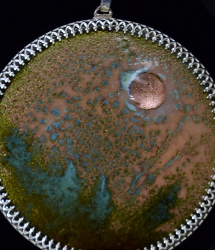 Emaille op koper in zilveren zetting; hanger. Techniek: high firing.