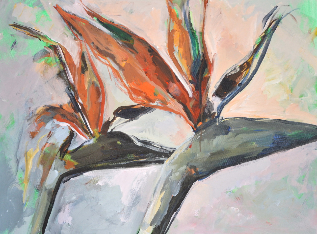 Bloem Bloemen Paradijsvogelbloem Paradijsvogelbloemen Stilleven Beweging Groen Grijs Oranje Rood Blauw Acryl Acrylverf Doek Canvas