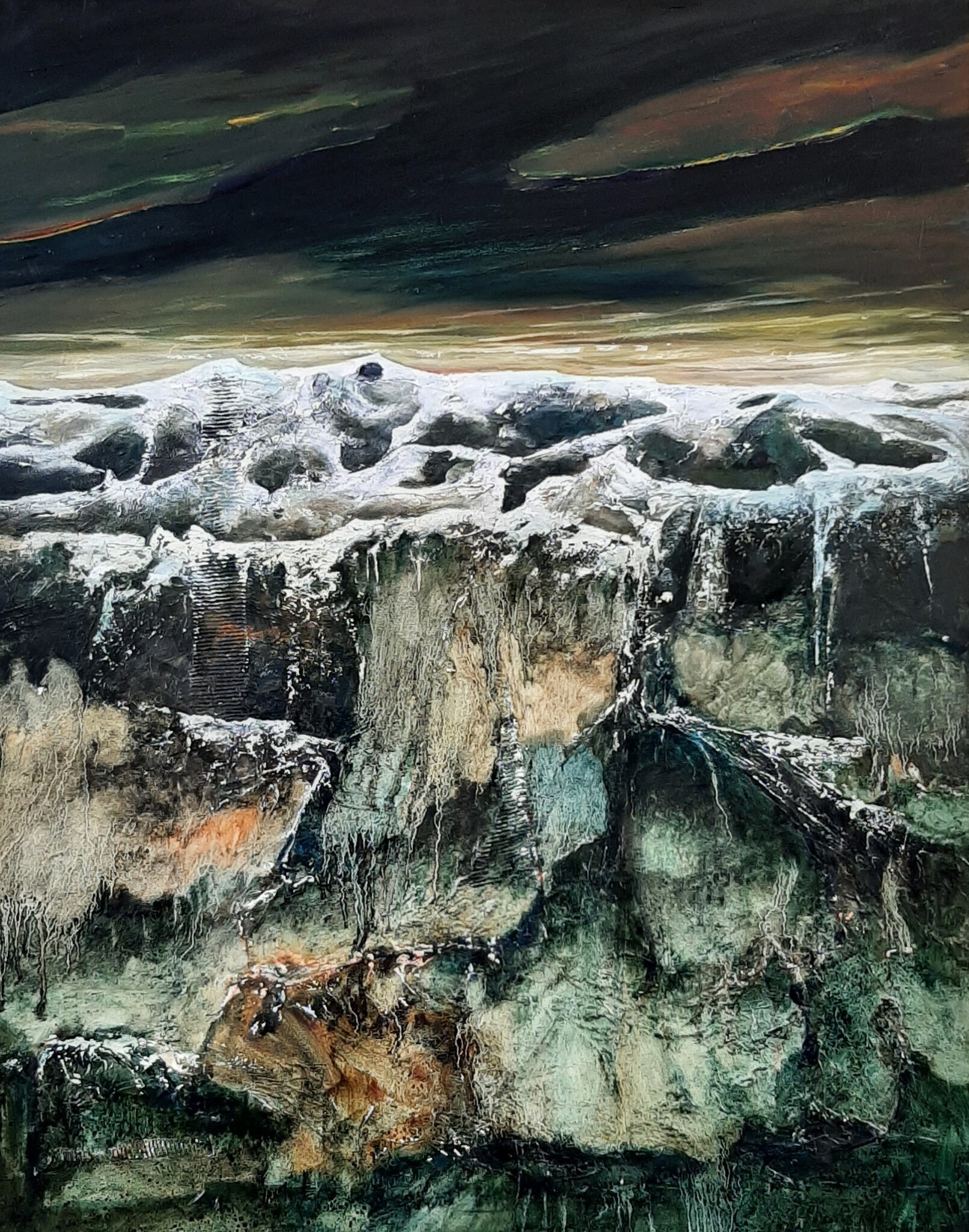 De Fjaðrárgljúfur is een indrukwekkende kloof in het zuiden van IJsland, iets ten westen van het plaatsje Kirkjubæjarklaustur. Globaal 100 meter hoog en 2 km lang. Door deze kloof stroomt de kleine Fjaðrá rivier die even verderop in de rivier Skaftá uitmondt. De Fjaðrárgljúfur is 's zomers een groene kloof. 's Winters heerst er een ander regiem. De kloof loopt door een zacht granualair gesteente waar zich lagen met lava en andere intrusies bevinden. De gigantische formatie is zo'n 2 miljoen jaar geleden ontstaan. Toen de ijskap zich aan het eind van de ijstijd terugtrok ontstonden er diepe meren en door de gletsjer uitgeslepen kloven en valleien. Met het verder smelten van de gletsjer werd er steeds meer puin naar de meren gevoerd, waardoor deze zich met verschillende sedimenten begonnen te vullen. Wat ik wil laten zien met dit schilderij is minder de werkelijke weergave van het landschap, maar vooral de tijdloze kracht en de invloed van het klimaat van de laatste miljoenen jaren op dit ruige stuk IJsland.