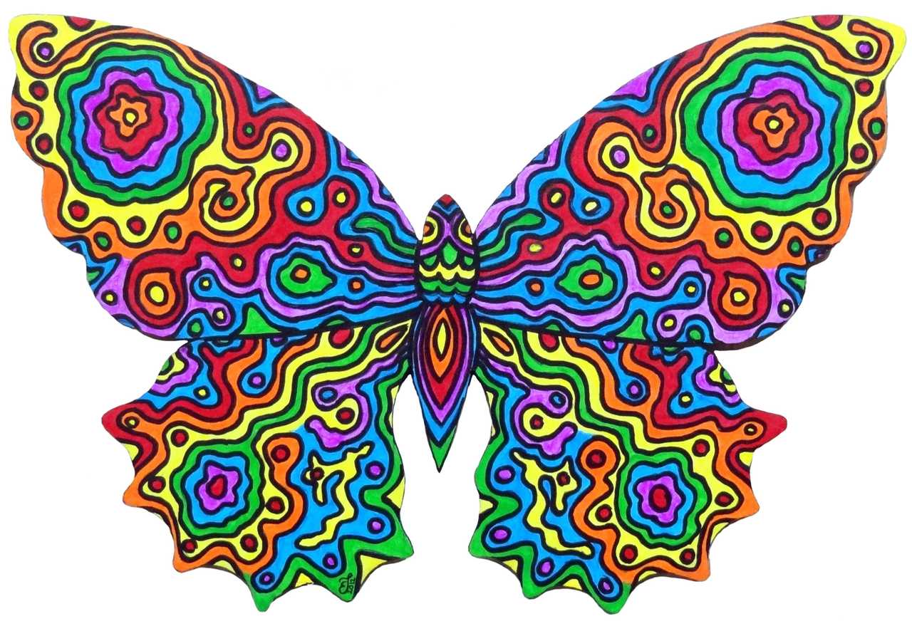 Een kleurige vlinder, op gezaagd paneel in vlindervorm.