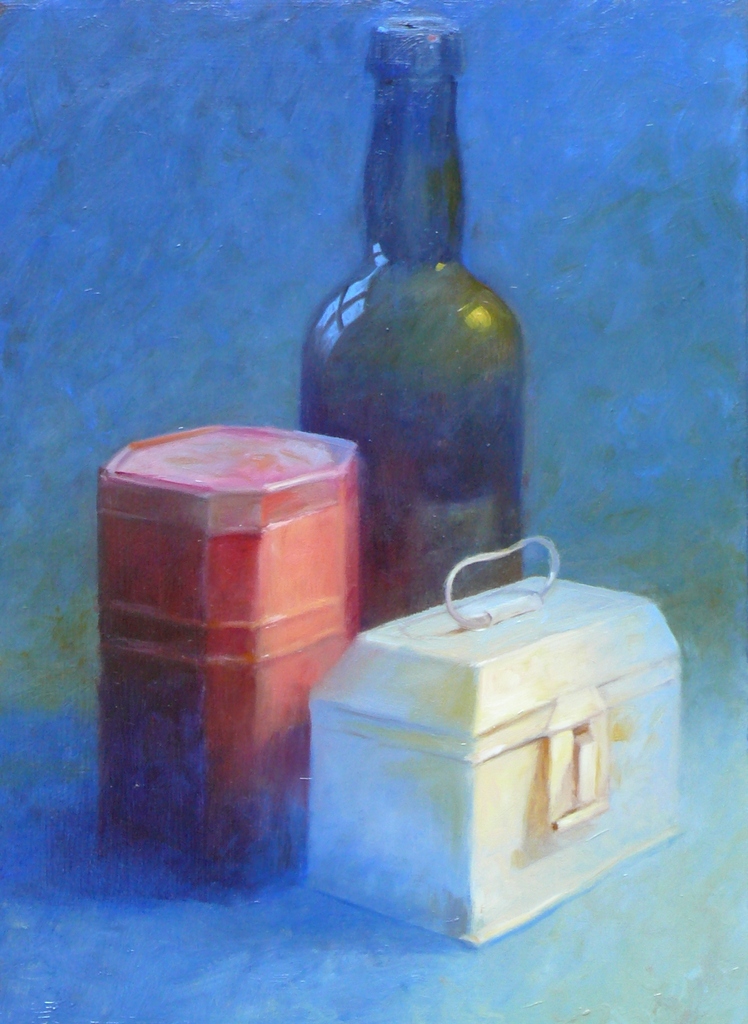 Stilleven op paneel olieverf grote fles bilkken doos