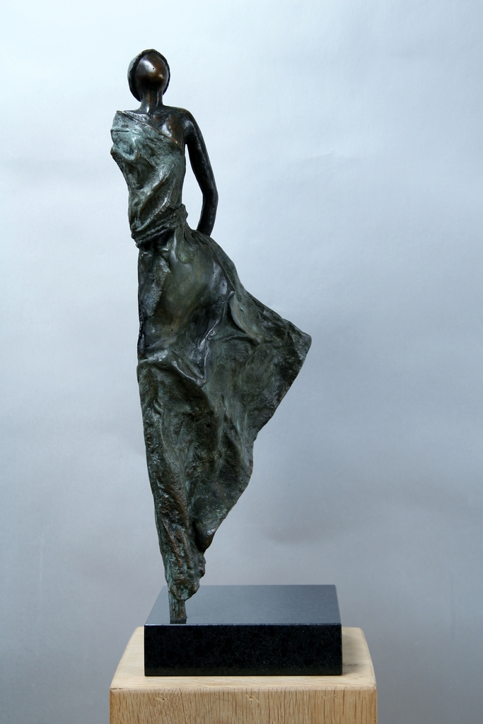 Bronzen vrouw. De prijs is inclusief stenen sokkel. Afmetingen stenen sokkel: 15x15x4 cm. Unicum.