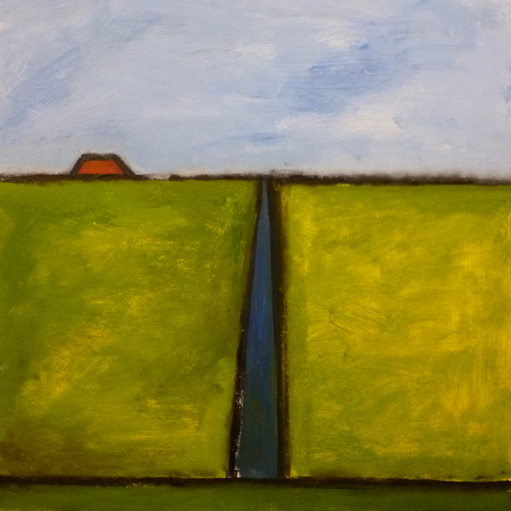 Ik neig ernaar om steeds meer weg te laten en ga daarmee een richting op die mij bevalt. Zo zie ik steeds meer, terwijl ik minder weergeef. 82 x 82 cm.