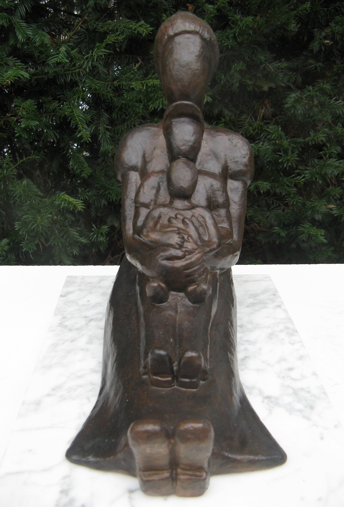 Bronzen beeld: twee kinderen op schoot bij een meisje of moeder.