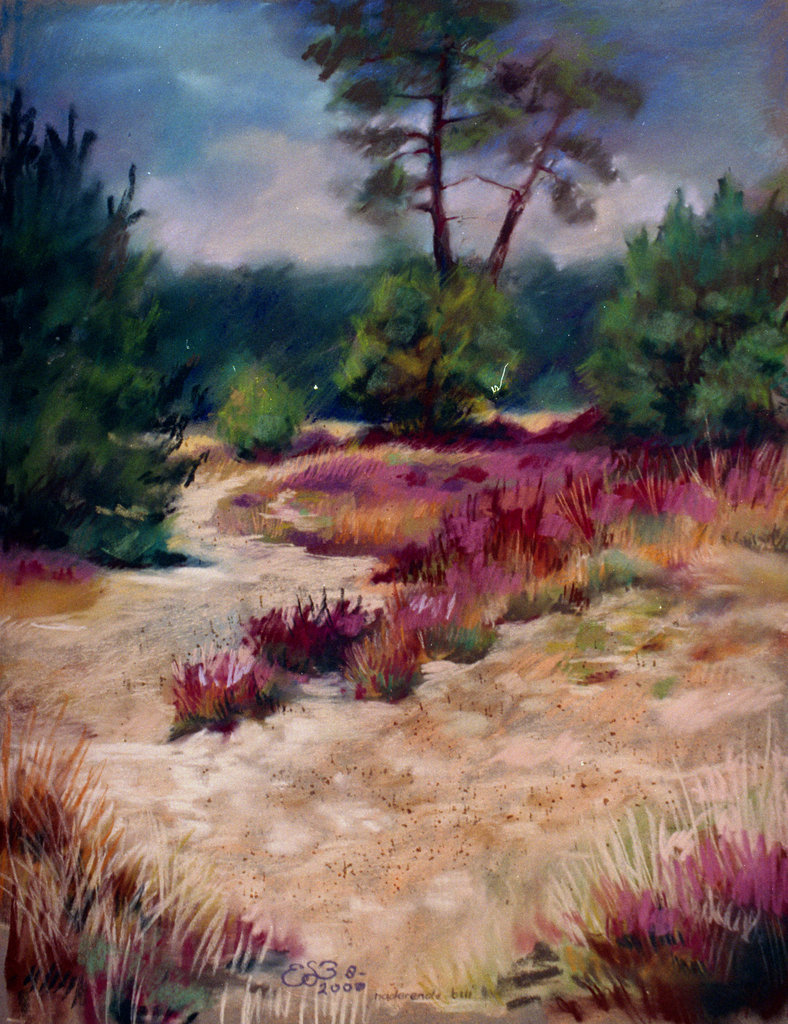 Naderende regenbui in Nationaal Park "Loonse en Drunense duinen". Pastelkrijt op sans-fix.