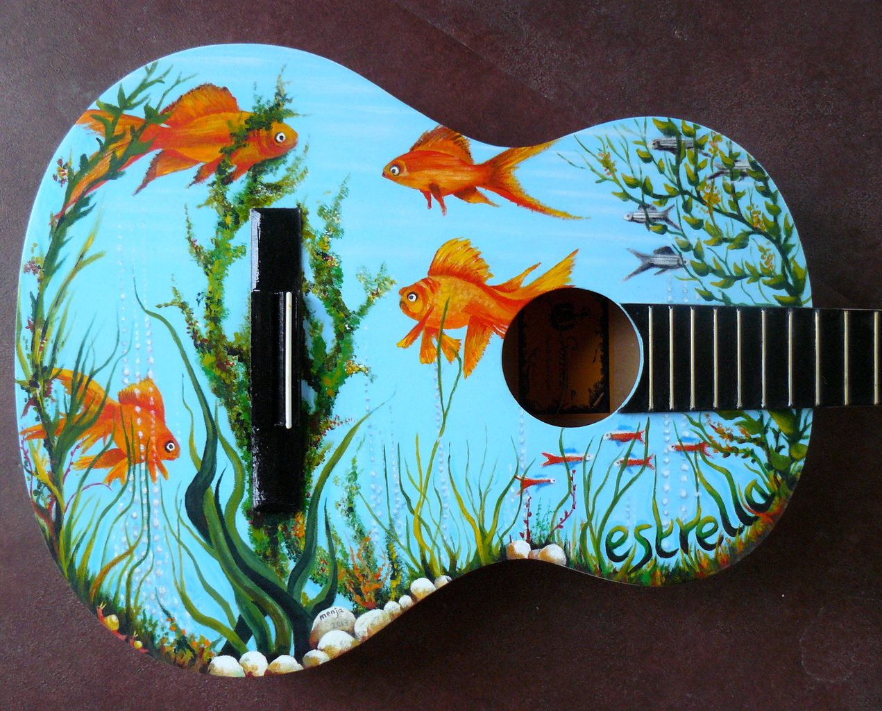 Spaanse gitaar beschilderd met een aquarium. opdracht.