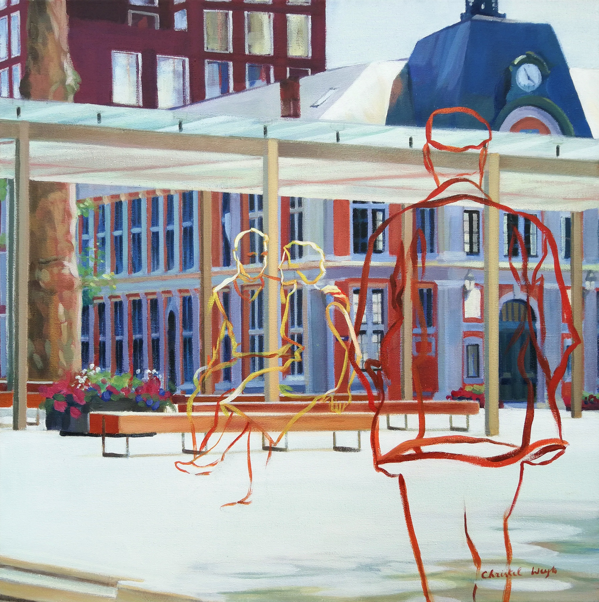 Dit werk kwam in verschillende fasen tot stand. Ik startte met de opzet van het stadsgezicht in open lucht in de buurt van het onderwerp. Jaarlijks schilder ik gedurende een dag, samen met andere schilders, in het centrum van Wilrijk. In de zomer van 2012 begon ik aan dit werk, een jaar na het overlijden van mijn vader. Thuis werkte ik het verder af maar nooit was het voor mijn gevoel volledig klaar. Ik miste leven en evenwicht in het werk én mijn vader die de laatste vier jaren van zijn leven als weduwnaar heel erg zijn best had gedaan om gelukkig te zijn in Wilrijk. Het plein was inderdaad te leeg, te stil en vroeg erom. De toevoeging van mijn ouders zoals ze lang geleden net samen waren en het beeld van mijn vader zoals hij de laatste tijd het plein en ons leven bewandelde, maakt het schilderij compleet.