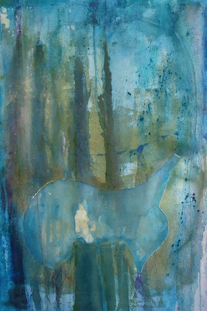 een doek met verschillende technieken, zand en olieverf met veel terpentine