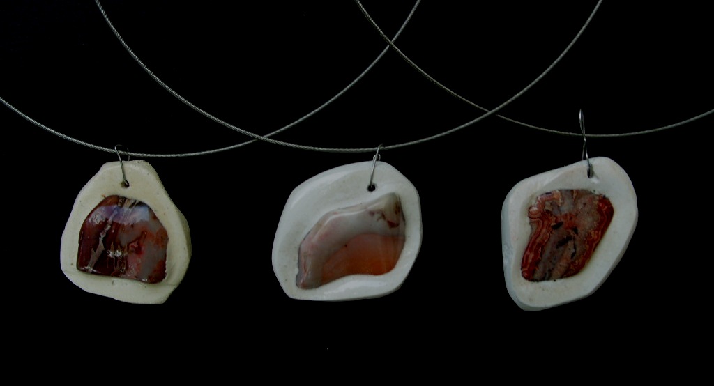 61.Drie gepolijste stenen in gips aan 3 verschillende spangen