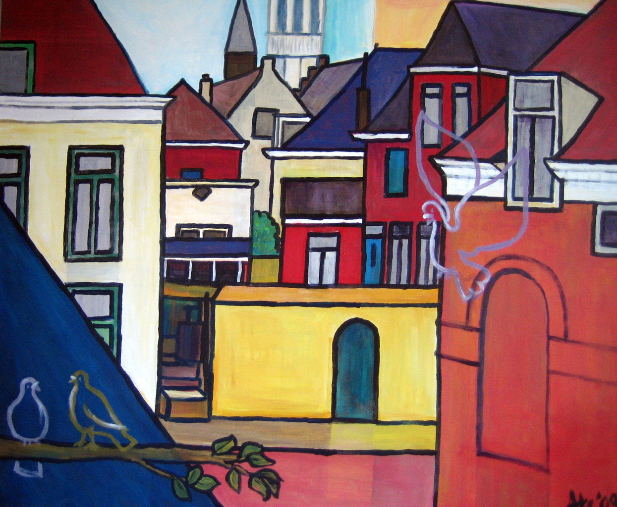 Rood Geel Blauw Huizen Kerktoren Duiven Red Yellow Blue Churchtower Pigeons