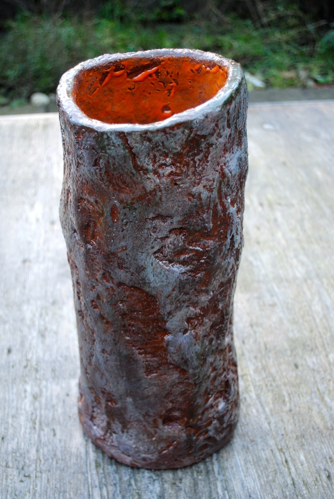 Deze vaas is een afdruk van een meer dan honderd jaar oude eikenboom. Het is in rode chamotte klei gemaakt en met glazuur bewerkt. De binnenkant met oranje glazuur.
