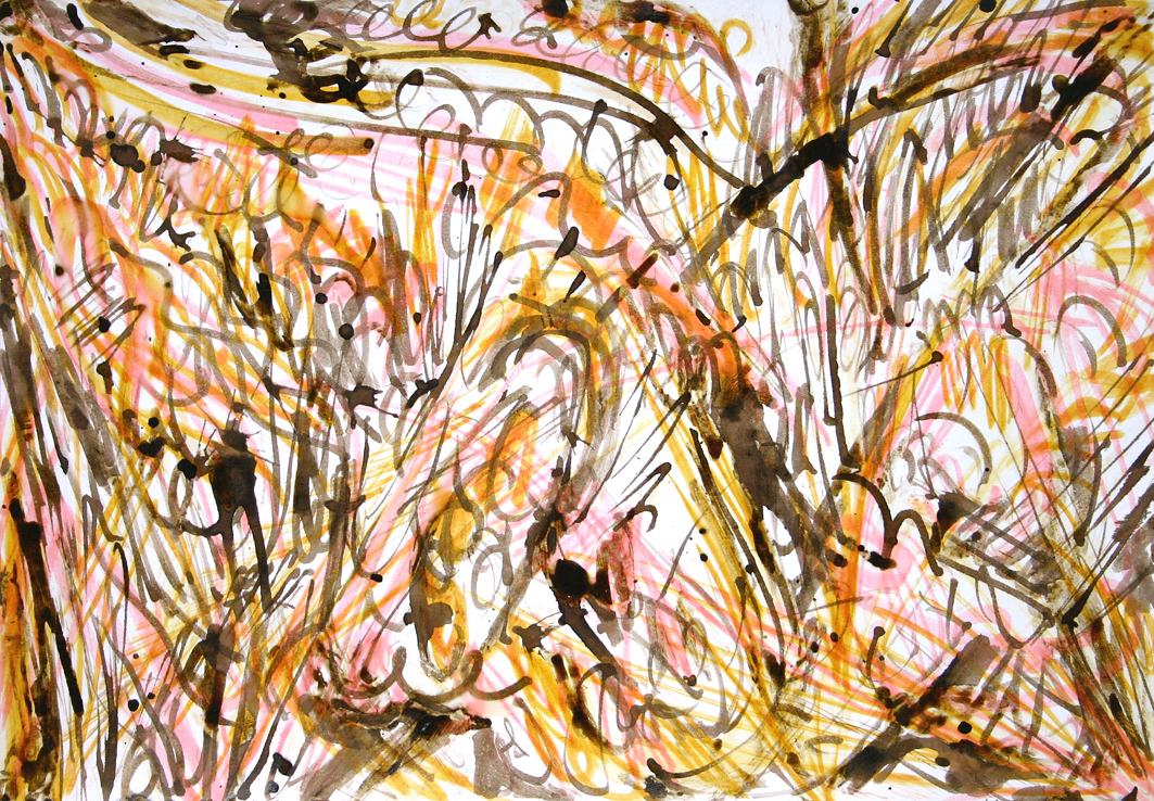 Landschap als pure wildernis, schoonheid van het ongeordende (inkt, bister, gelpen, stift, acryl op papier)