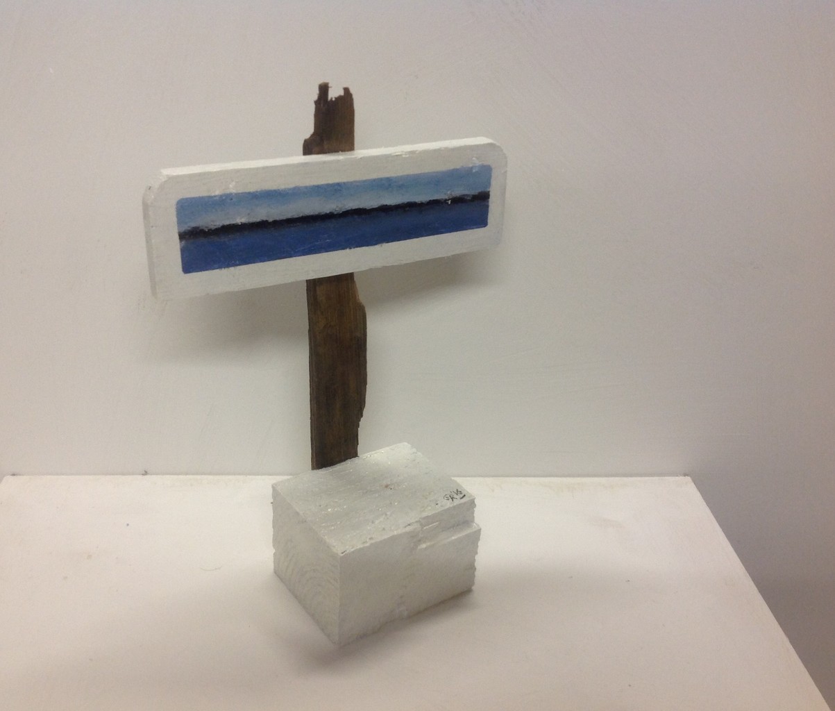 Zeeschildering/-object. Getiteld "Vooruitkijkspiegel". 40 x 20 x 10 cm.