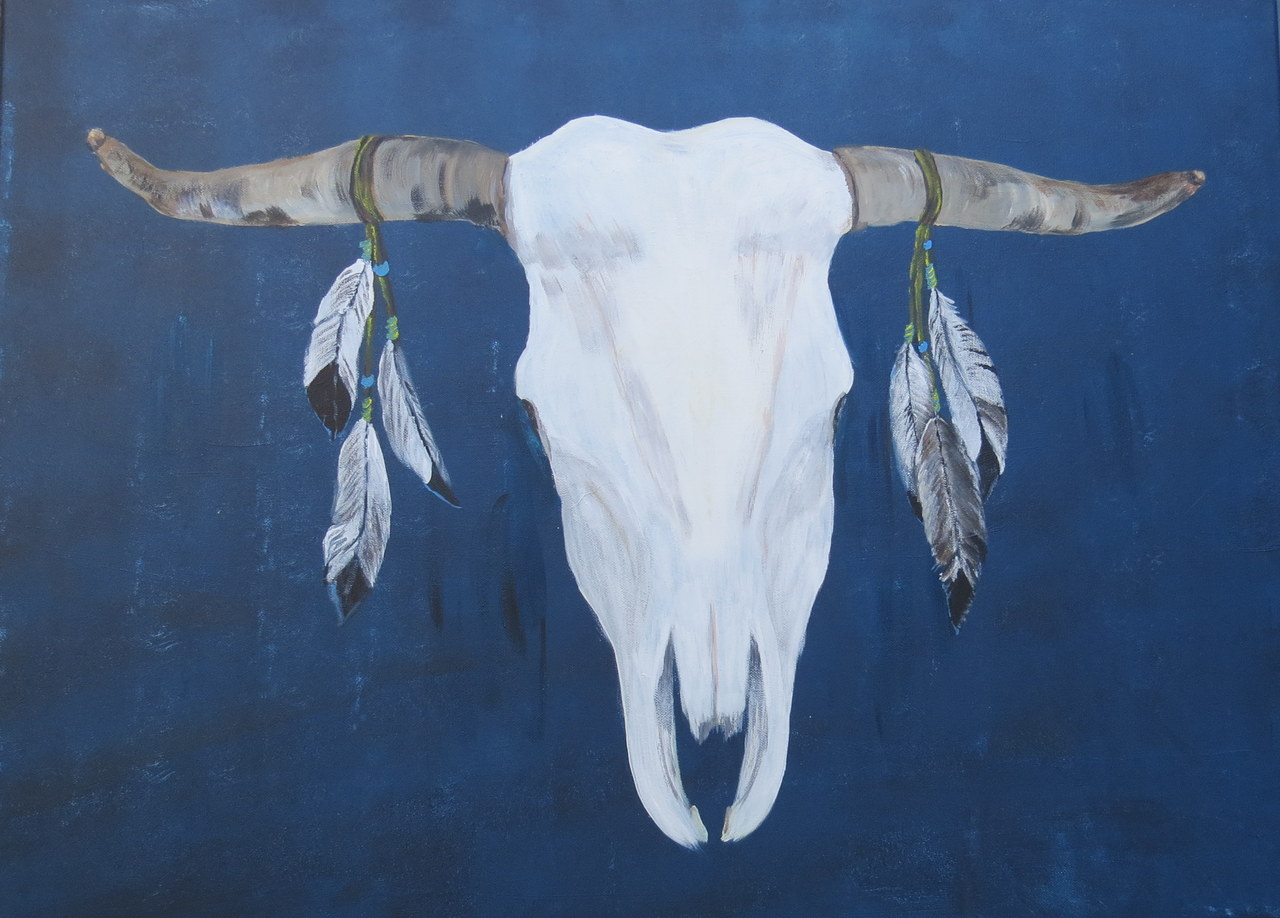 Runderschedel met versiering zoals gebruikelijk bij sommige indianenenstammen in Noord Amerika