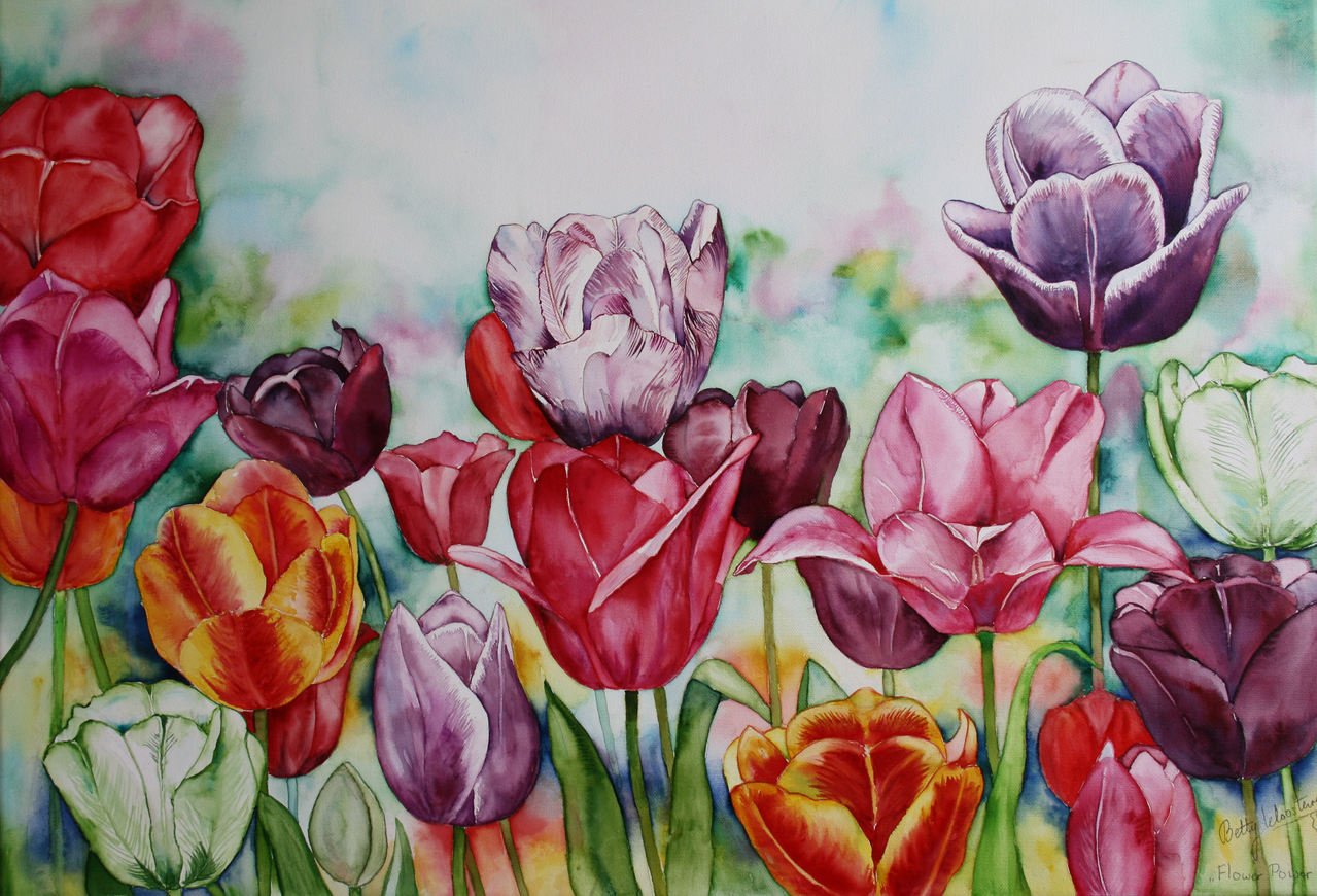 Flower power, veelkleurig tulpen schilderij. Aquarel door een speciale techniek op doek geschilderd.