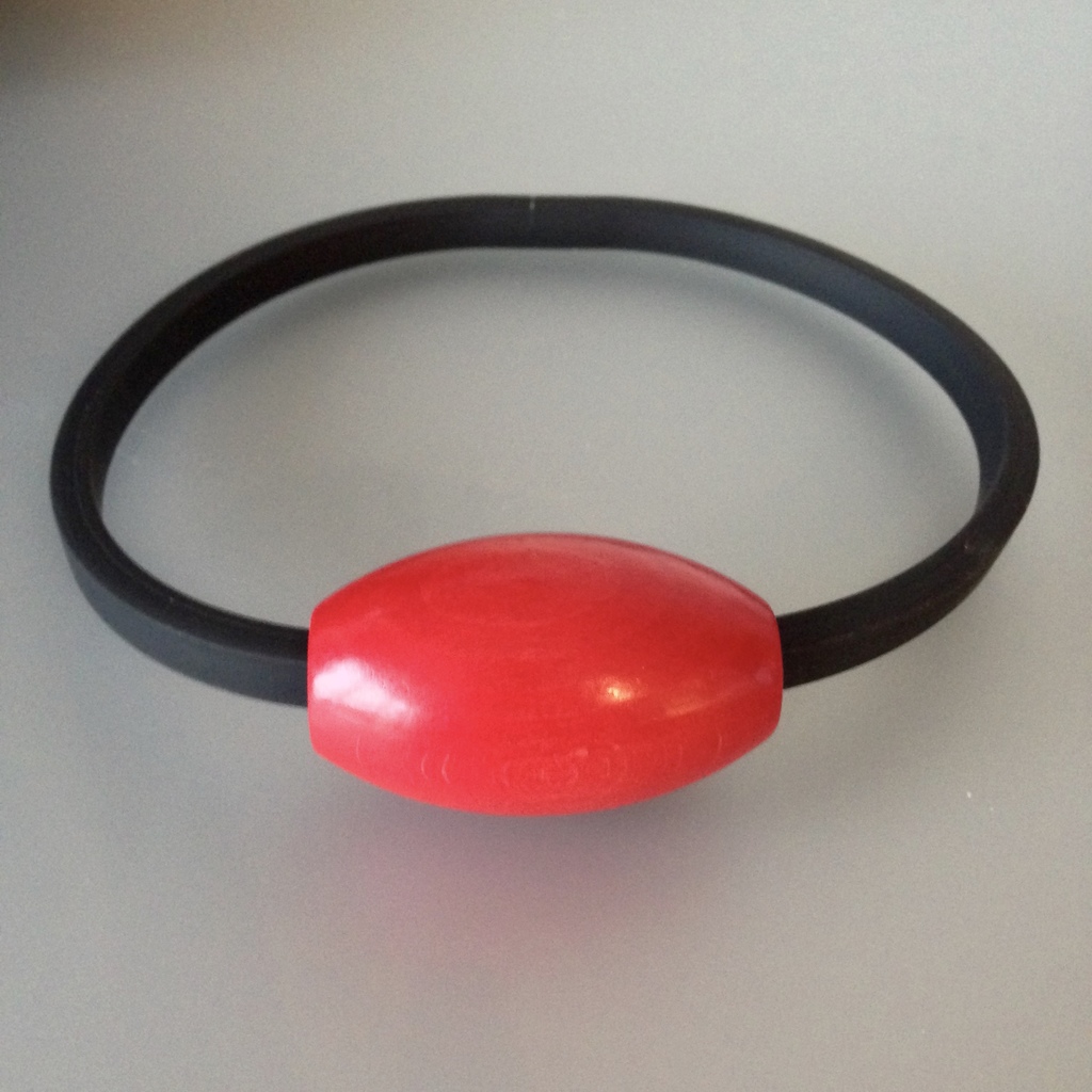 Zwart kunststof en rode kraal van hout.