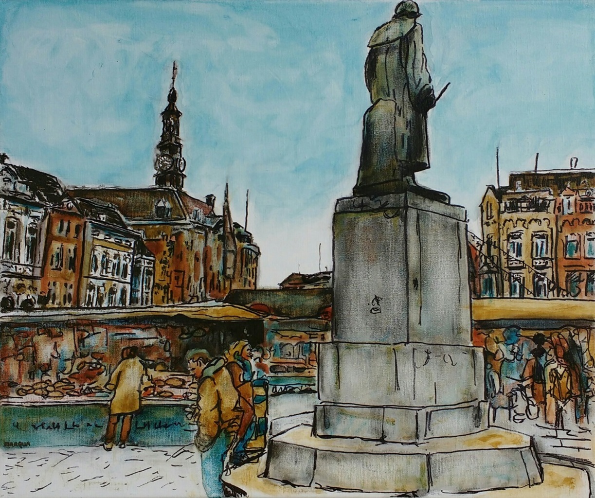 Stadhuis, (waren)markt en standbeeld Jheronimus Bosch te 's-Hertogenbosch. Getekend en geschilderd met rietpen en penseel in vier kleuren inkt op linnen doek 50x60 cm. Jeroen Bosch met zijn schilderspalet in de hand en een voorbijganger met zijn mobiele telefoon... een van de verschillen in 500 jaar! Pruisisch blauw, zwart, wit, grijs, gebrande siënna (rood-bruin), umber (geel-bruin).