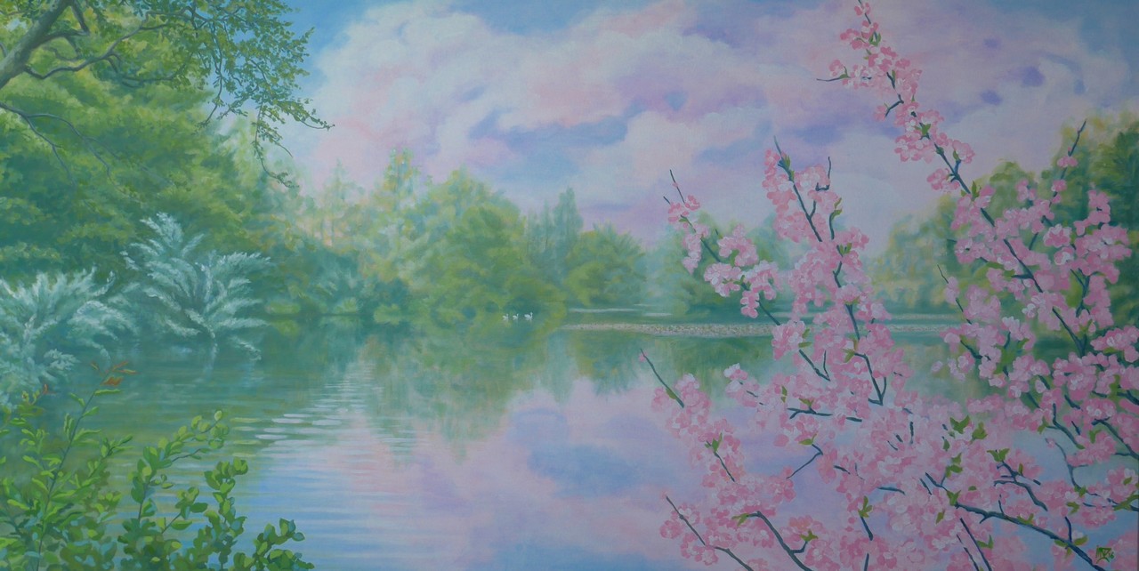 Bij bepalen van het formaat van dit schilderij in opdracht is rekening gehouden met de plaats op de muur waar het moest hangen. De kleurzetting door de kleuren van het interieur.