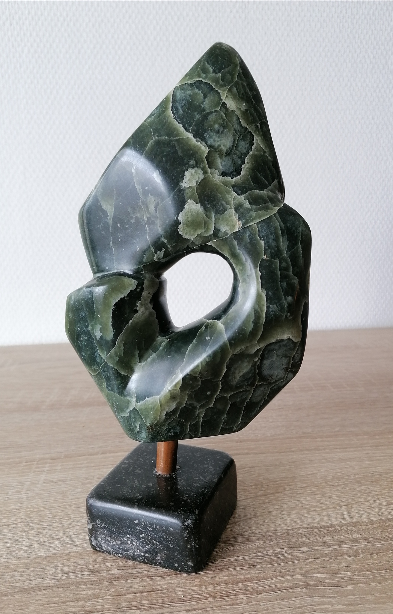 Abstracte boom met gat, gemaakt van donkergroene speksteen. De andere kant van het beeld heeft ook de vorm van een abstracte boom. De steen heeft een prachtige tekening.