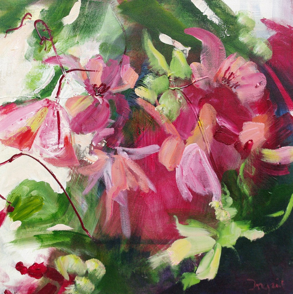 Ingrid Swinkels - van der Weijden (1952) Durf, lef, dynamiek......acryl. Al jong begonnen met tekenen en schilderen. Later aquarelleer-lessen gevolgd bij Jo Manders en Willem van der Velden. Puur uit nieuwsgierigheid en op zoek naar nieuwe technieken ben ik de 5- jarige opleiding aan de academie voor schone kunsten in Arendonk gaan volgen met daarna 2 jaar specialisatie. Het is telkens weer een grote uitdaging en spannend op het doek te vertalen, wat er in je hoofd leeft en borrelt. Vaak is het een gevoel groter dan jezelf.... Kwetsbaar, onrustig, zoekend, niet geordend.... Het leuke is mezelf steeds te verrassen met wat er gaat gebeuren! Ik wissel de wat 'strakkere bijna grafische periodes", waarin het onverwachte lijnenspel me zeer intrigeert, af, met 'los' kleurrijk, figuratief - ab