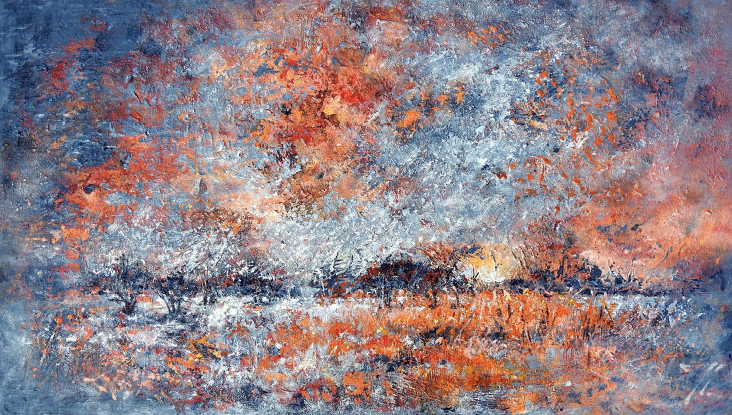 Krachtig abstract landschap, geïnspireerd op een uniek natuurgebied. Warme oranje- en koele blauwtinten botsen en vloeien samen, wat het werk een emotionele, expressieve lading geeft. De suggestie van water en lucht brengt beweging en sfeer. Het schilderij is opgebouwd in lagen, met veel textuur. Een evocatief werk vol natuurkracht. Over het werk: gesigneerd · acryl en mixed media op linnen · opgespannen op stevig frame · meegeschilderde zijkanten · 4 cm dik doek · klaar om op te hangen