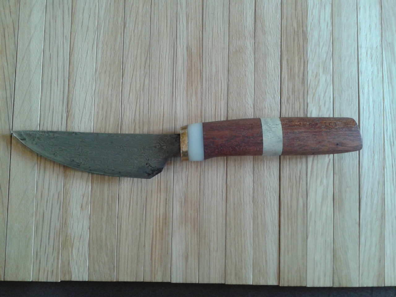 Deze keuken mes is gesmeed uit een blokje damast staal (Damaststaal is staal dat bestaat uit een groot aantal lagen staal die op elkaar gesmeed zijn) . het handvat is gemaakt van messing,nylon,meranti hout en een middel ring van Keniaanse speksteen.